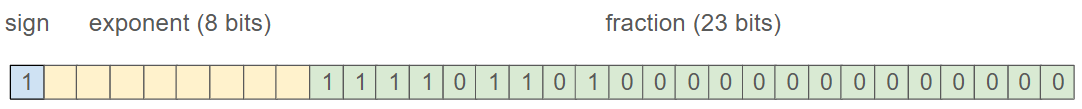 이후, 맨 앞 1을 제외한 나머지 111101101를 가수부에 저장합니다. 이 맨 앞의 1은 정규화 과정에서 항상 존재하는 것이 보장되는 값으로(맨 앞 1 다음으로 소수점을 옮기기에) 암묵적으로 간주되므로 저장할 필요가 없습니다(이를 "hidden bit"라고 함). 가수부의 제일 왼쪽부터 111101101을 채우고, 나머지 빈 공간은 0으로 채웁니다.