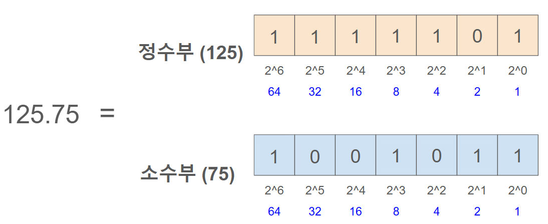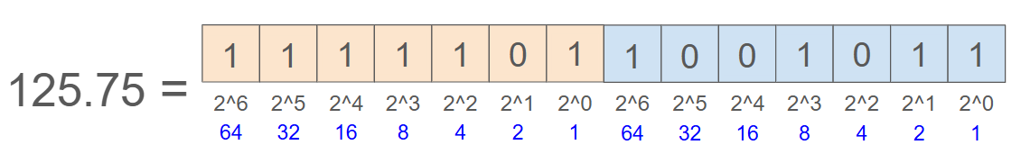 부호를 제외한 125.625를 이진수로 변환합니다. 다만, 정수부와 소수부를 별도의 규칙으로 변환합니다. (소수부는 왼쪽부터 2의 -1승, 그 다음 2의 -2승... 과 같은 규칙으로 변환)